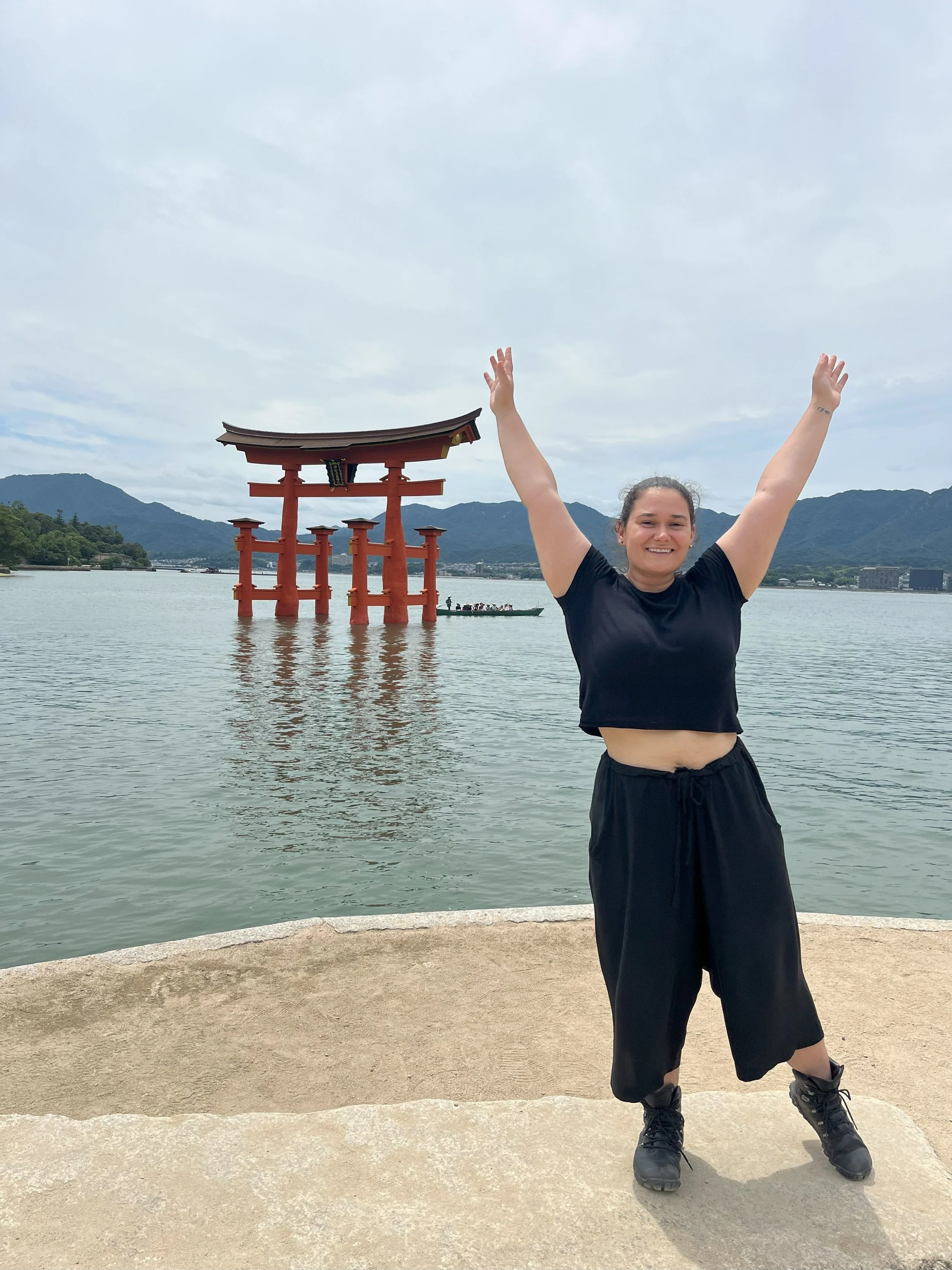 Fotka z ostrova Miyajima u města Hiroshima, v pozadí je známa brána torii patřící ke shinto svatyni Itsukushima, červenec 2023