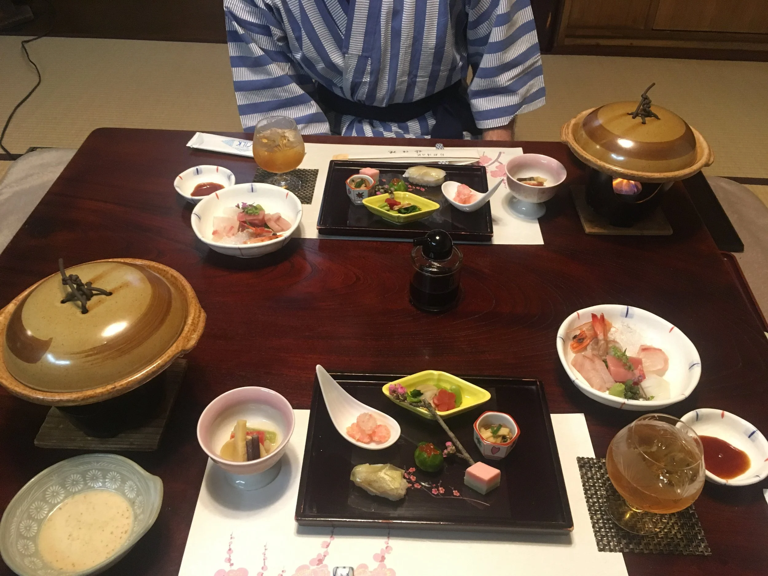 Tady nás čeká velmi nezvyklý zážitek, a to přespání v tradičním japonském hotelu zvaném ryokan 旅館, který je zapsaný na seznamu národního dědictví. Velká řada slavných spisovatelů a politiků z přelomu minulého století zde nějakou dobu pobývala a oddávala se krásám zdejší přírody. Pro našince bude krajně netradiční spaní na zemi na futonech, ale také spaní po čtyřech na pokoji. Na jednu noc se společně vrátíme do dob školních výletů :D Nemusíte se bát nechtěné intimity! Poprosím personál, aby nám rozestlala futony, co nejdál od sebe (často se jedná o dva pokoje oddělené posuvnými papírovými dveřmi). Tento hotel nevyniká pouze svou historickou důležitostí, ale nabízí také úžasné tradiční večeře a snídaně (v ceně) tzv. kaiseki ryōri 懐石料理 a neomezený přístup do společných horkých pramenů. Onseny jsou pro muže a ženy oddělené a do bazénků se chodí úplně nahý bez prostěradla či ručníku. Highlightem tohoto hotelu ale je, že nabízí i privátní menší lázně. Každý pokoj si může bez příplatku zamluvit tři časové úseky tří různých malých privátních onsenů.