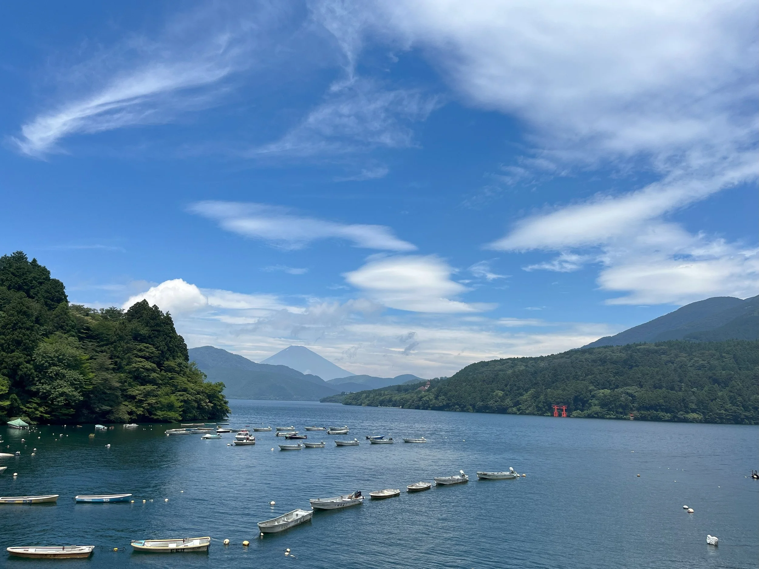 Výhled na horu Fuji tyčící se nad jezerem Ashinoko 蘆ノ湖