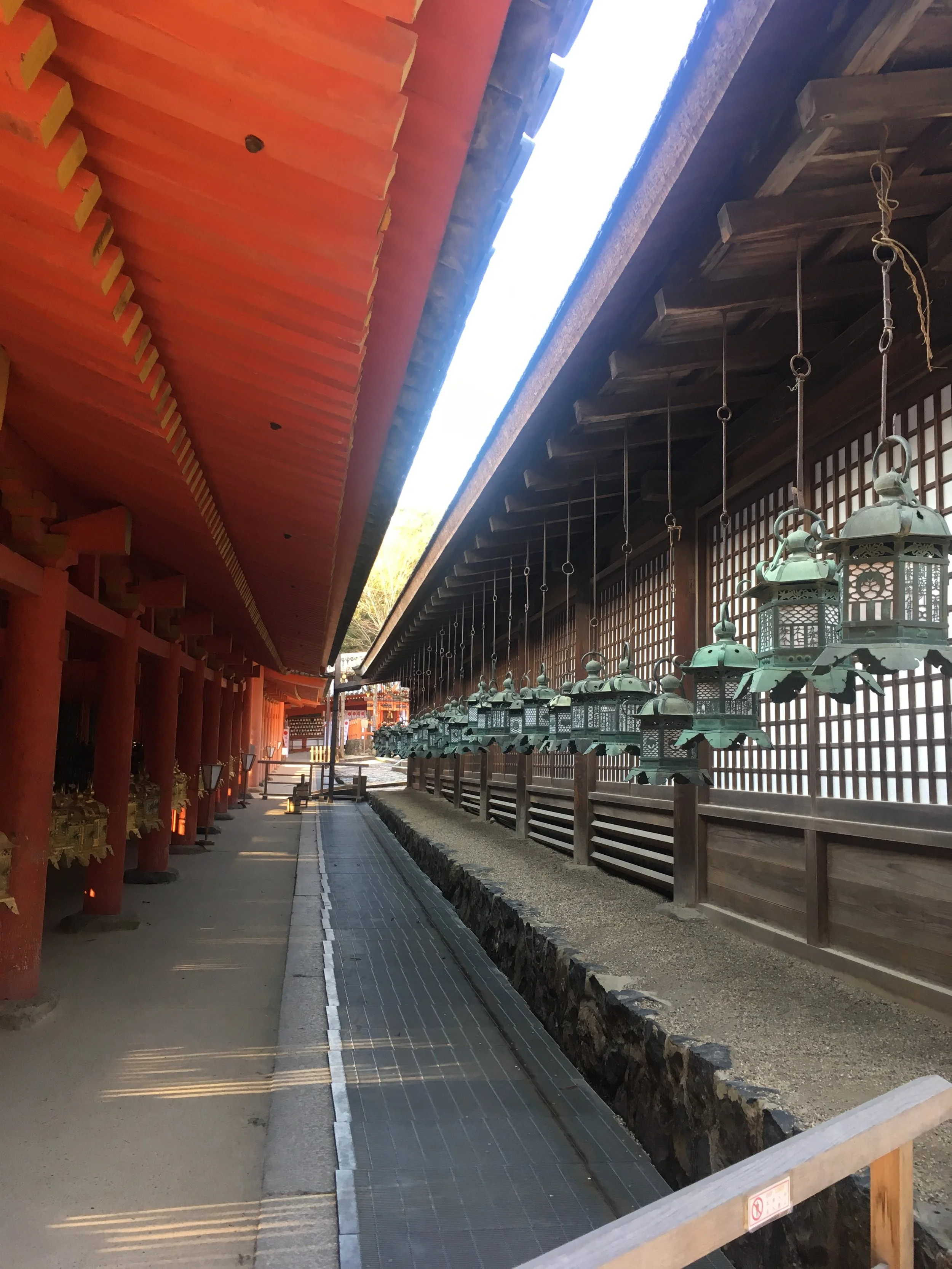 Pohled na dlouhou řadu luceren šintó svatyně Kasuga 春日大社